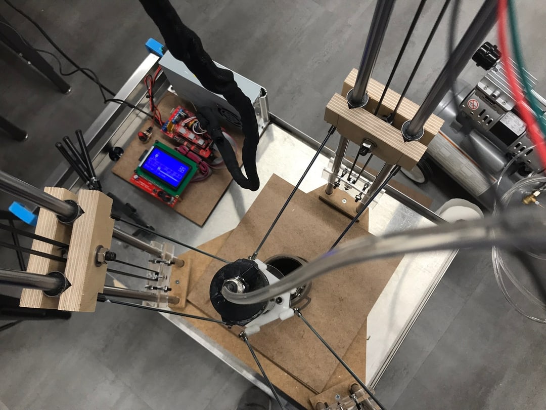 Starting from July 2019, I am building a Delta-style ceramics 3D Printer with Floor Van De Velde, a Professor from the School of Museum of Fine Arts at Tufts (link to bio). For the first version of our printer, we adapted the design from Jonathan Keep, while making modifications and improvements on several aspects, including the three sliding brackets at the sides, fixturing method for the rods, the upper plates, etc.