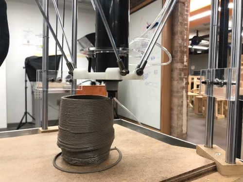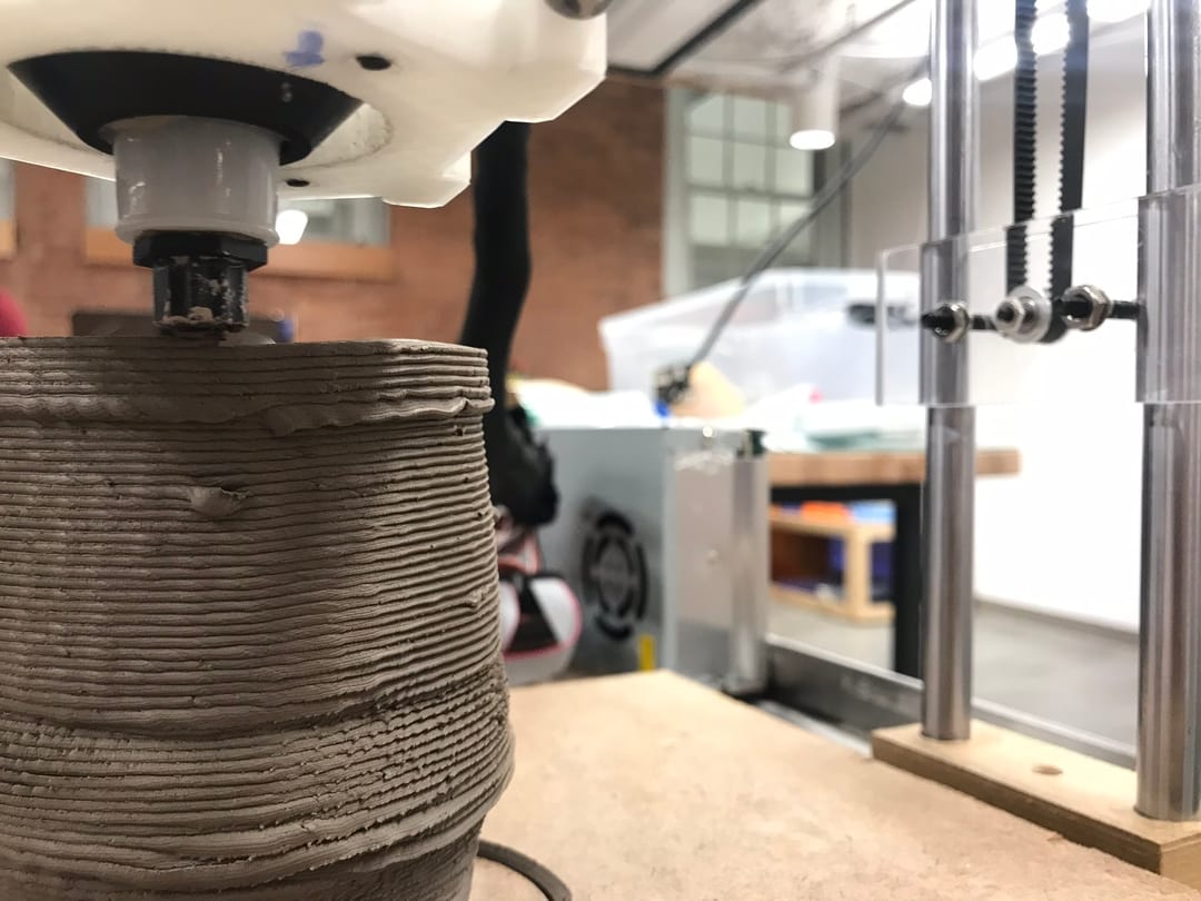 After two weeks of calibration, clay preparation, and electronics debugging, we finally made our first successful print! The extruder is working consistently and the stepper motors are interpreting G-code fairly accurately. While this is a great start, we still have a lot of improvements to make: finding a more suitable nozzle, securing the stepper-motor belt, improving the calibration process, etc.