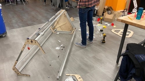 We recently assembled the main structure for the first time. We have not yet placed the orders for the aluminum plates, and are substituting the aluminum plates with laser-cut plywood of the same thickness as temporary placeholders. This way we can double-check to make sure that the design does not have any major flaws when we place the big money order for custom fabrication.