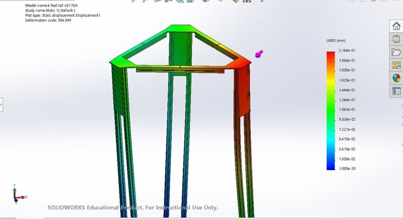 After completing the assembly, we decided to add more supporting structure to the main frame in order to make the printer more stable. To find out what structure does the best job, we created a simplified model in SolidWorks and ran some preliminary FEA analysis on the structure coupled with different support structures. For each scenarios, we added both torsional and horizontal load for a more well-rounded evaluation.