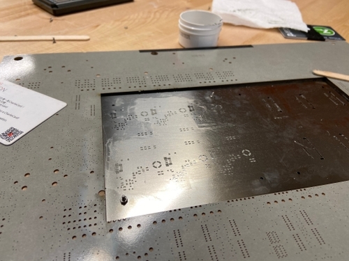 Reflow-soldering the board is much more difficult than I anticipated. On the one hand, I'm doing double-sided assembly with fine-pitch components; on the other hand, having a large, panelized PCB with only 0.6mm thickness certainly did not help... An important lesson I got from this project is that while PCB panelizing can be cost and time efficient, it can easily backfire :)