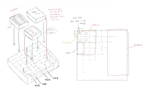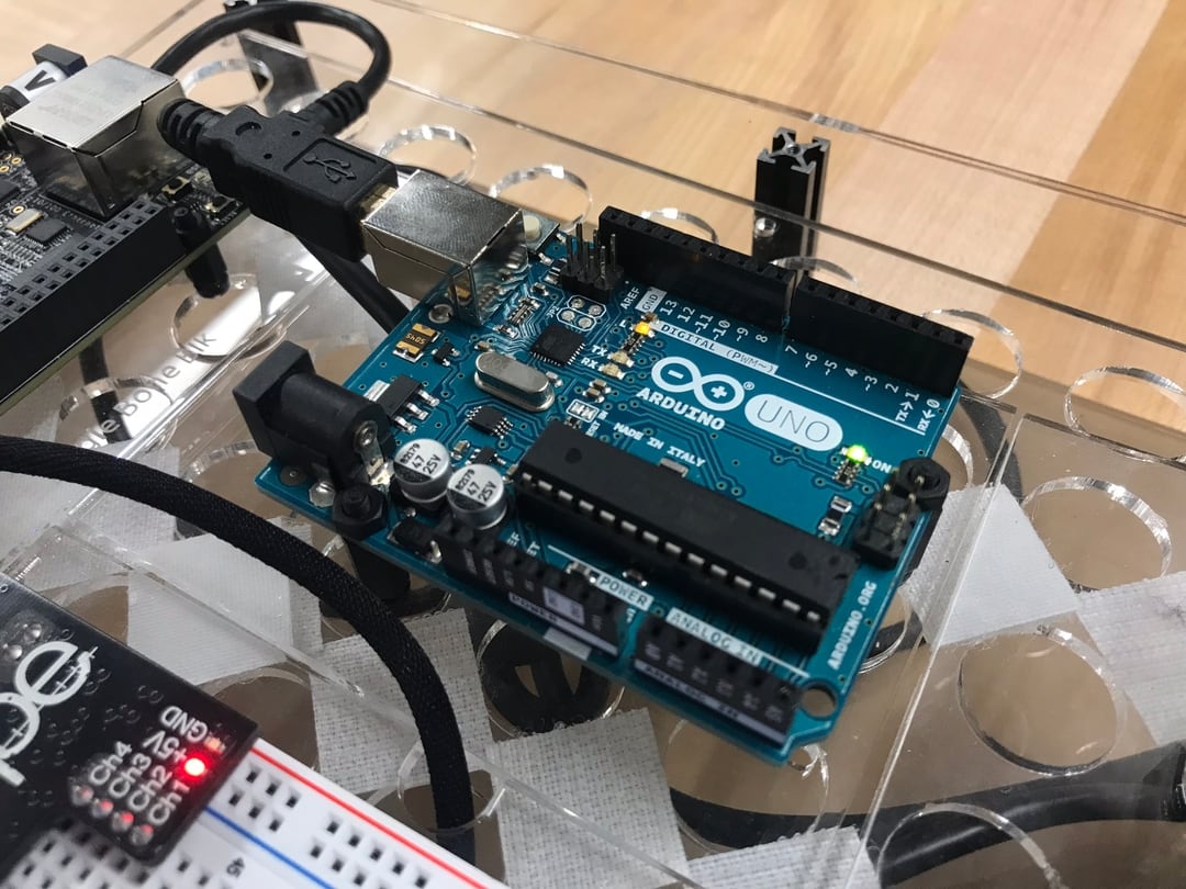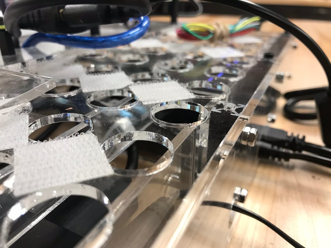 The main structure of the board is made out of laser-cut acrylic, with some MakerBeams as reinforcements for structural stability. The top of the main frame has circular cuts that are placed 1 inch apart from each other, a modular system that allows cables to go through and plug in to the microcontrollers. Each microcontroller is mounted on a small piece of acrylic, which then attaches to the main frame with Velcros.