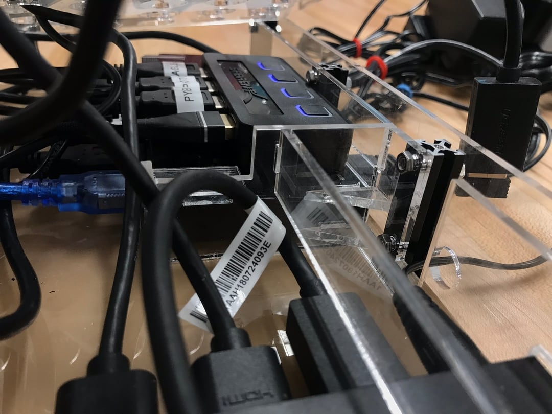The acrylic structure was mostly designed in SolidWorks and Adobe Illustrator. The pieces were joined together by bolts, nuts, and acrylic cement. Some inner structures were added to secure the USB hub and the HDMI hub in place. No glue of any sort was applied to the hubs and cables, so that they can easily be reused for other purposes.