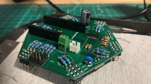 I adapted the design from the PCA9685 servo driver from Adafruit. I replaced all the surface mount parts (except the PCA9685 chip) to through-hole components, and sent the PCB files to a website to get it manufactured. I then later soldered the SMD chip to the board using a microscope.
